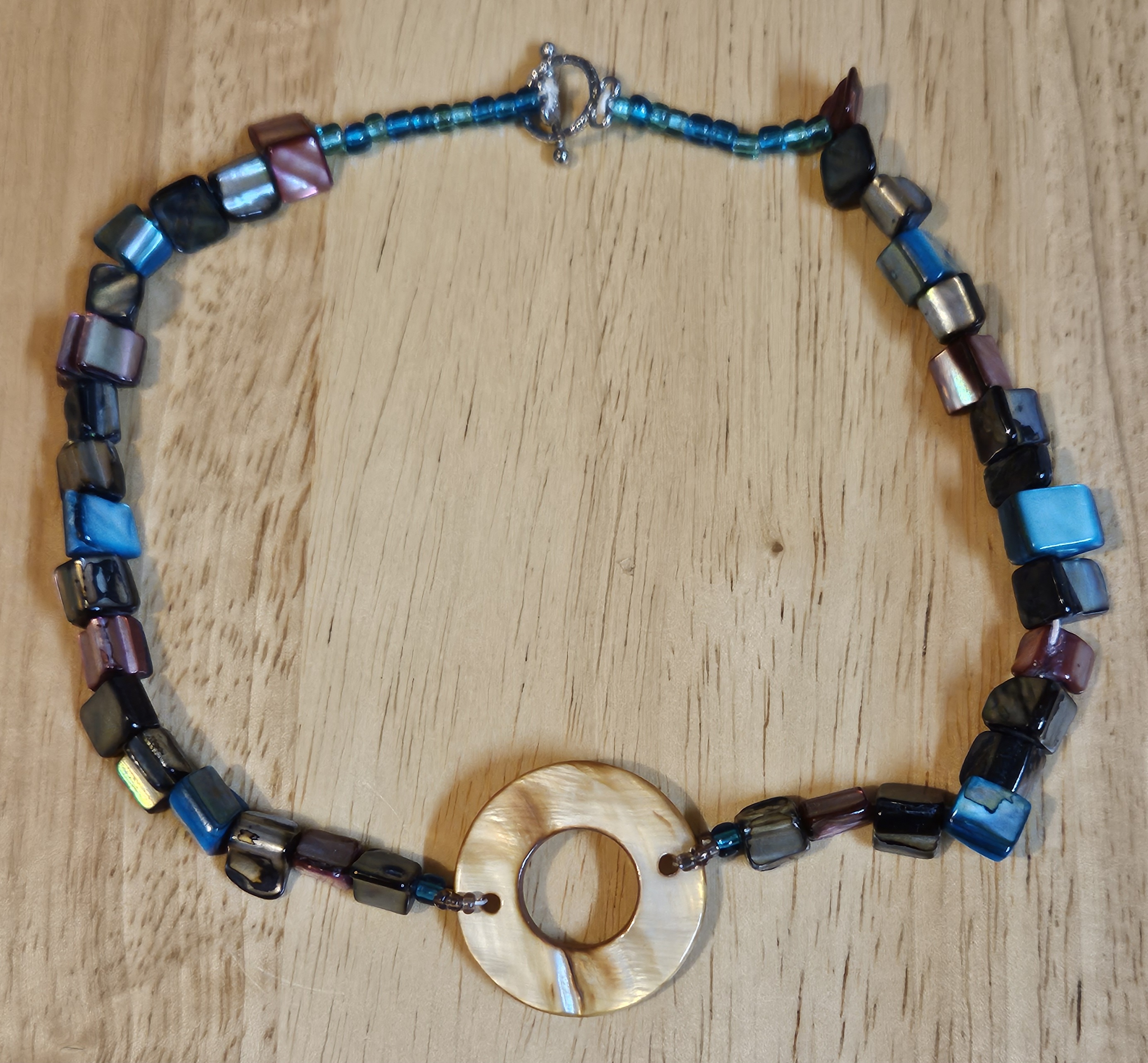 | Necklace: Abalone Shell Choker with Centerpiece Pendant (closeup, beads) |